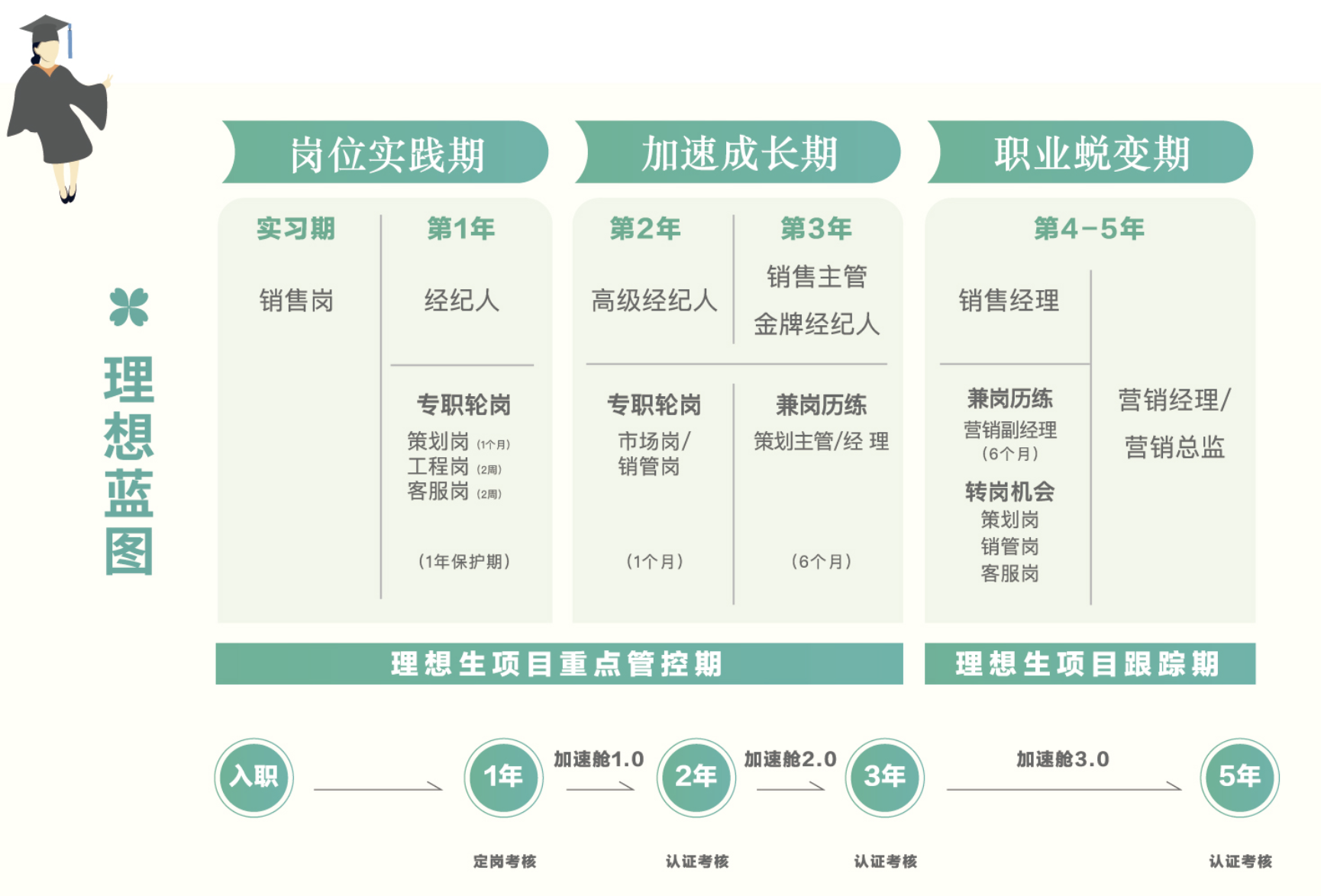 “理想生”是绿城中国面向国内外本科及以上院校毕业生打造的营销管培生项目。旨在选择目标清晰、勇于挑战、热衷创新、作风务实并在社会实践及学生活动中表现优异的潜力人才。该项目通过“5年3阶段”专属培养路径,系统赋能、快速成长,助力各位成为公司的营销管理中坚力量。