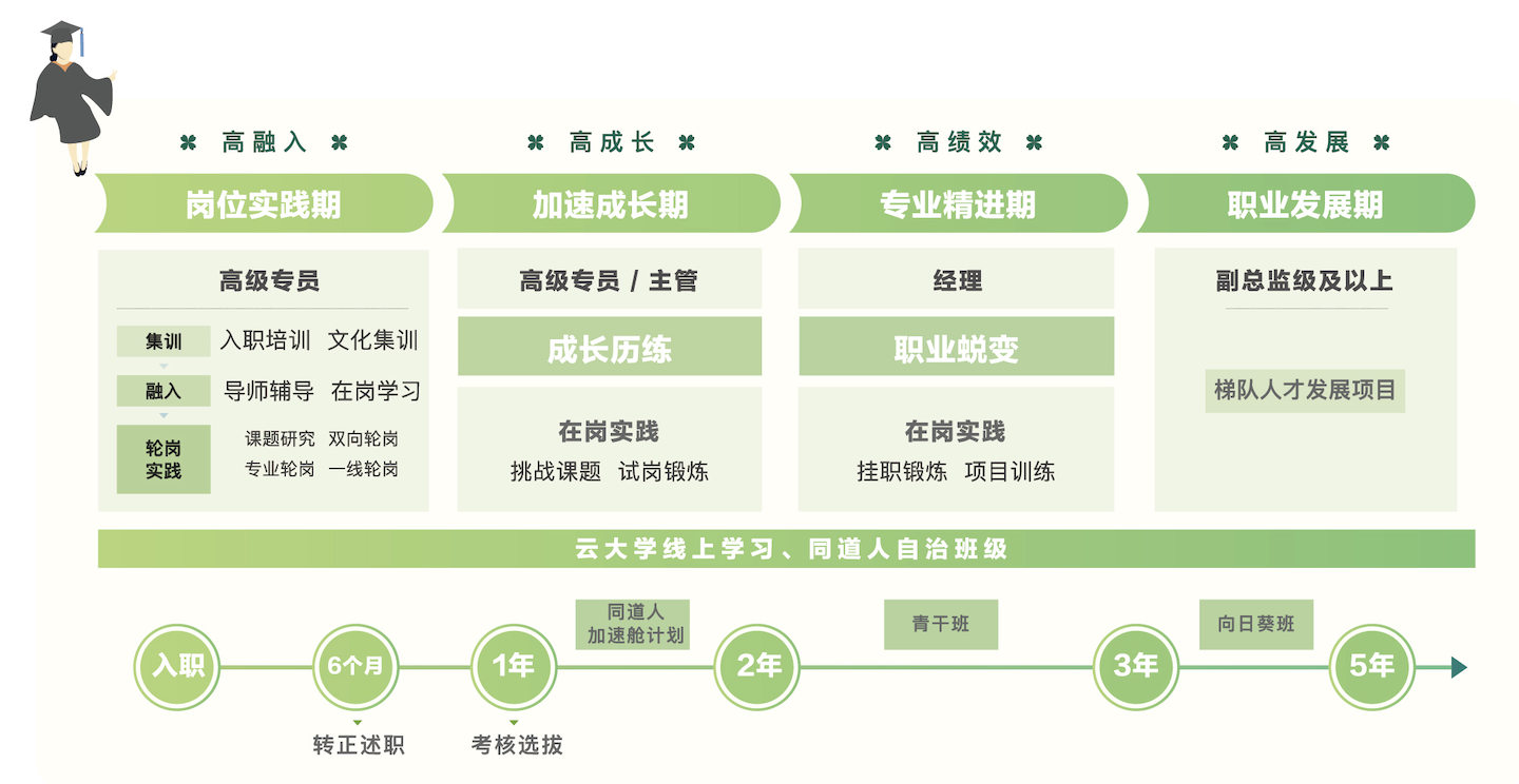 作为一家以“追求完整价值”为终极目标的企业,绿城对校招生量身定制了培养计划。集团总部持续关注,通过岗位实践、加速成长、专业精进助力校招生职业的持续发展。