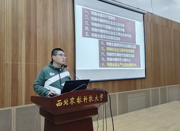 商晓辉老师以“深入学习贯彻党的二十大精神”为题,从二十大的历史地位、主要内容、核心要义、实践要求等方面进行了系统全面的解读。他用生动形象的语言和丰富的案例,深入浅出地阐述了党的二十大精神的重大意义和指导作用。结合我校专业建设和学科特点,他鼓励入党积极分子坚定理想信念,增强使命担当,勇于创新创造,秉承“扎根杨凌、胸怀社稷;脚踏黄土、情系三农;甘于吃苦、追求卓越”的“西农精神”,积极投身“三农”事业,为全面建设社会主义现代化国家,全面推进中华民族的伟大复兴而团结奋斗。