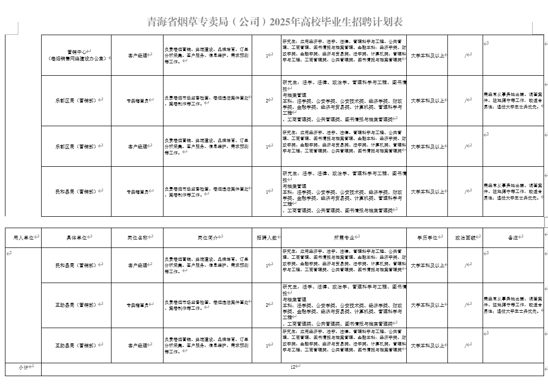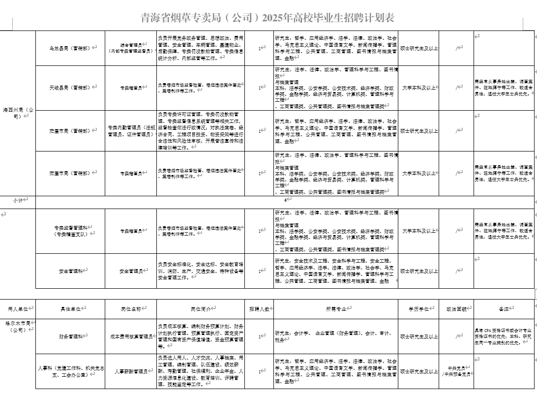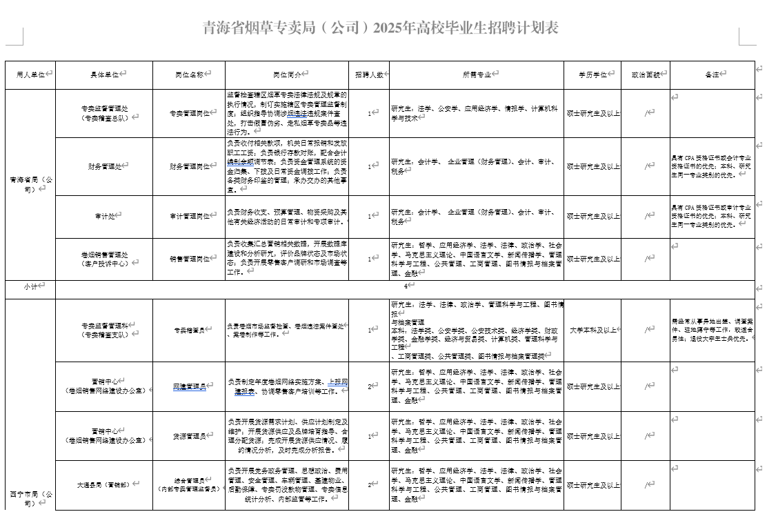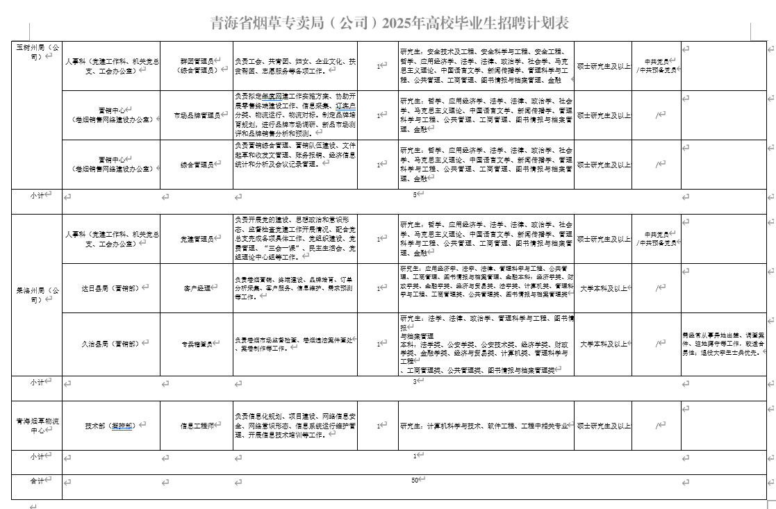 (一)本次共计招聘50人,具体用人单位、岗位名称、招聘人数及资格条件等详见《青海省烟草专卖局(公司)2025年高校毕业生招聘计划表》(附件1)。