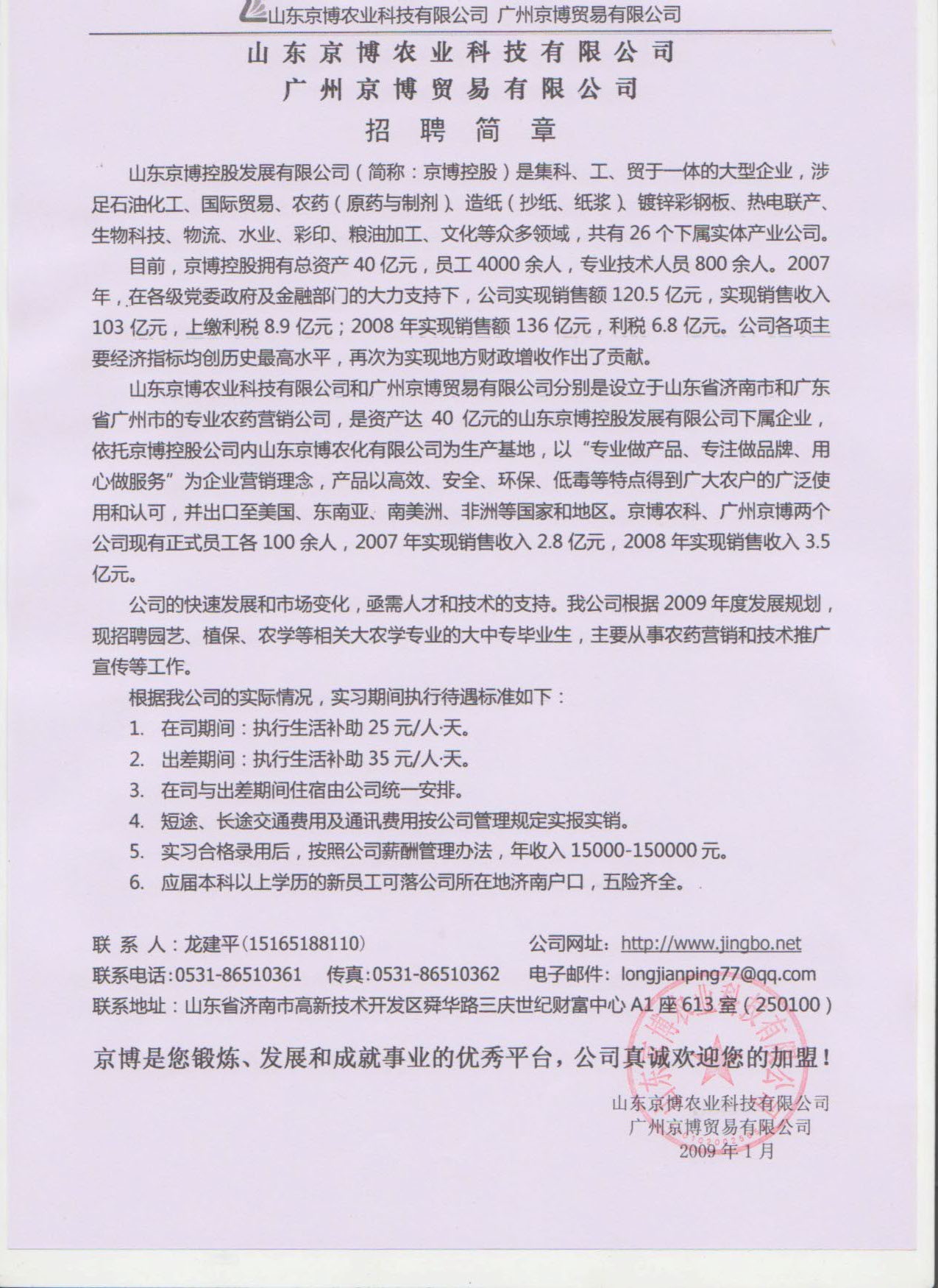 山东京博农业科技有限公司定于2009年3月10日9:00时在金沙官网院办多媒体教室举行专场招聘会,公司简介、招聘岗位及要求等详见招聘简章(附件)。