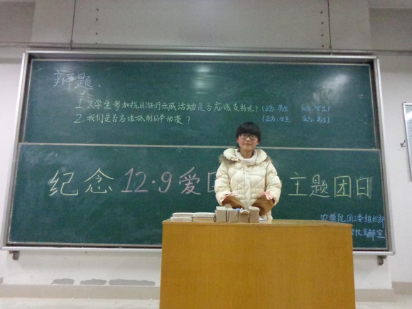 此次活动以辩论会的形式展开,主要围绕“大学生参加抗日游行示威活动是否应该支持?”“是否应该抵制日本动漫?”两个辩题展开辩论。辩论中,正反方各抒己见,有理有据,慷慨激昂,会场气氛十分热烈。活动期间各位参加的同学积极发言,大家认为,虽然表达爱国的方式不尽相同,但同学们都希望我们的祖国能够安定统一、繁荣昌盛,希望能为中华民族伟大复兴的事业,贡献自己的力量。
