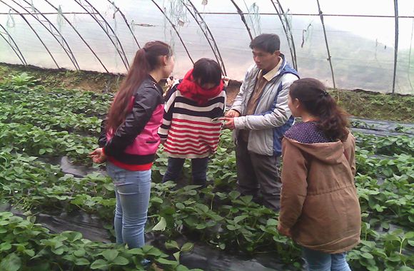 11月8日上午8点田园使者帕尔哈提等五人前往斜上村常兴果蔬合作社,帮助农民对大棚中的秋季草莓进行整理参观,并与农民进行交流学习。