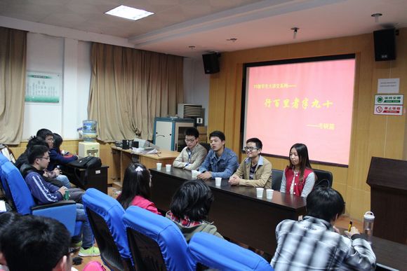 宣讲同学均为10级考研成功者,具有丰富的考研经验,其中张远、王棹仁考取中国科学院,吕天琦考取浙江大学,胡文平跨专业考取中国人民大学。四位宣讲同学结合自己的考研经历分别详细地介绍了备考期间应注意的事项,包括考研各科的复习方法、信心的确立、考研计划、备考心态以及有关专业方向的选择和最后的复试等。随后,考研同学们就自己备考期间遇到到和疑惑与宣讲同学进行交流。