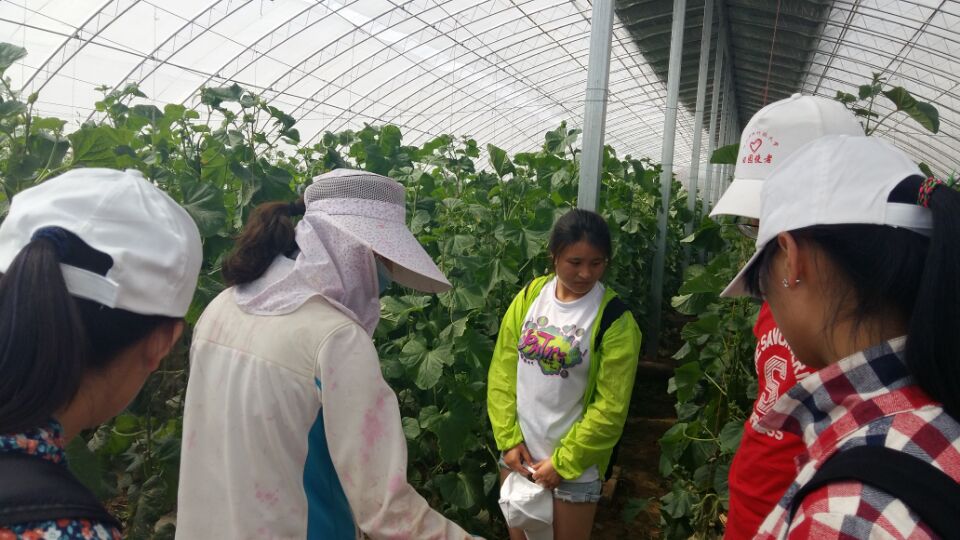 刚到达合作社,由于合作社负责人要招待一些过来参观的游客,大家便在农庄里面熟悉情况。在无公害蔬菜大棚里面,见到了正需要给甜瓜授粉的工人,她向大家详细地介绍了甜瓜的发育状况、以及防病防害的措施,并且教大家如何在实践上给甜瓜授粉。在授粉的过程中,田园使者们发现有几株甜瓜叶片上出现白色霉菌,就为如何防治这种病害展开探讨。队员们认真聆听记录,积极出谋划策,想要用自己的专业知识对合作社尽绵薄之力。