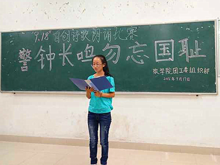 “转眼间,已是八十五个春秋,可那血与泪的历史记忆,依旧令人不忍回首”农学类1603班郭瑞士同学的原创诗歌《九·一八,那沉重的岁月》带领大家重新回到那充满硝烟的岁月;农学1601班庞津雯同学的诗歌《我的祖国,儿为你抹去忧伤》中“我们已经长大,就让我们做母亲的盾牌,让她免受伤害”字字铿锵,道出了农院学子的爱国情怀。