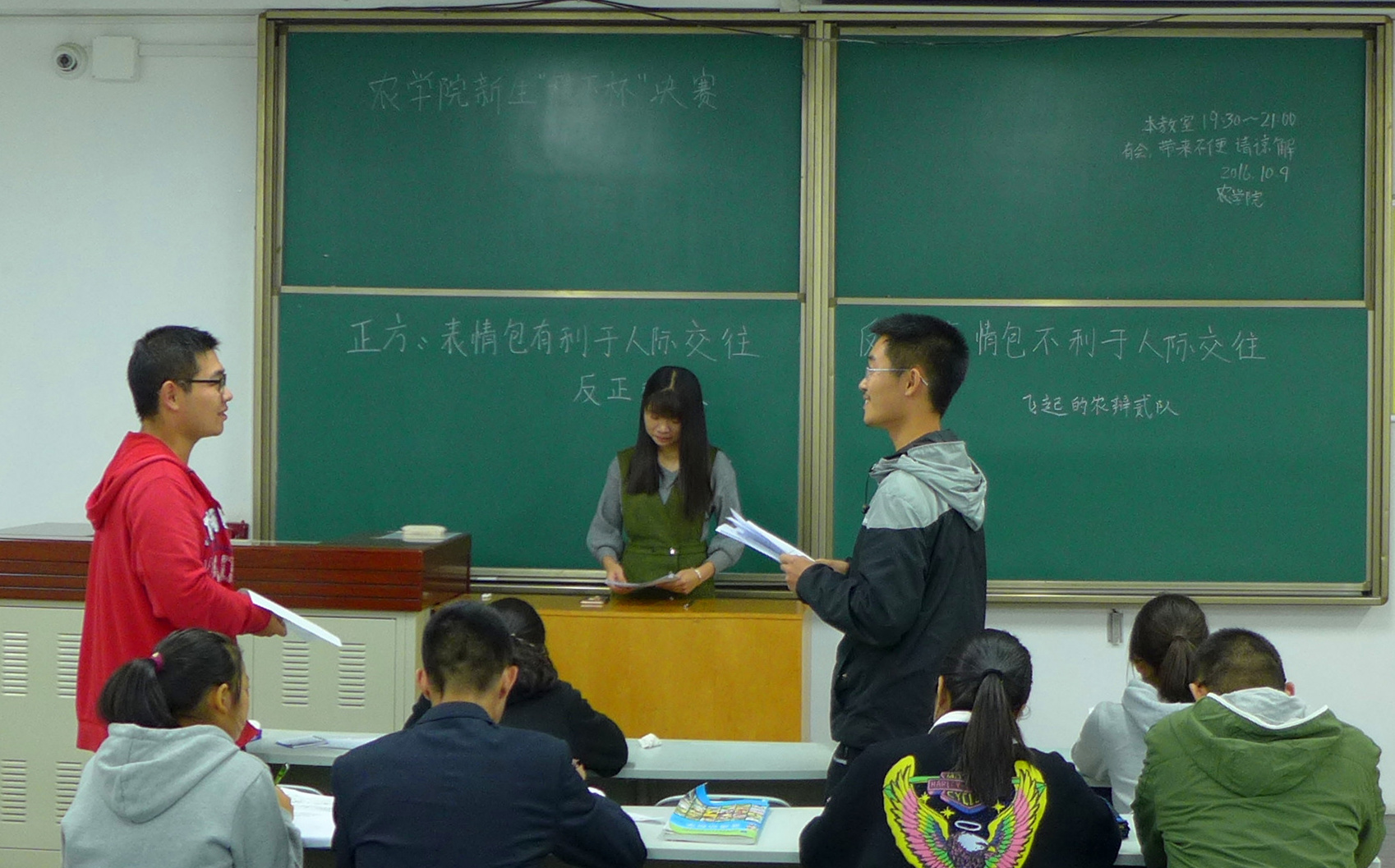 2016年10月9日晚,js555888金沙老品牌2016“稷下杯”新生辩论赛决赛在北校区八号教学楼8218举行。js555888金沙老品牌辩论队11级华冠勋、12级刘益宏、13级王豪乐及水建学院,园艺学院,机电学院的15级队长、总务、领队担任评委。