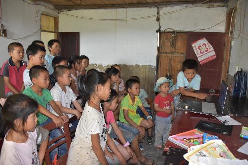 8月7日,服务队为他们准备了动画片——《大圣归来》。孙悟空永远是小孩心中的英雄,他们的眼睛一直放在屏幕上。
