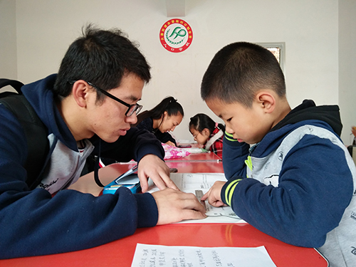 所有小朋友都到达培训室后,刚好队员们可以对小朋友进行一对一辅导。今年9月份刚上二年级的小男孩,面对展开的数学作业本直皱眉头。当辅导队员问他情况时,他不好意思的低下头说:“哥哥,这个题我不会。”二年级的数学题当然难不倒来自西农的大学生。张文军同学马上耐心的为他讲解,还拿起尺子为他解答。另一个一年级的小女生,显然是还没有认识很多汉字。高升同学一边指着语文课本上的注音,一边细心的带她进行拼读。还有一位小朋友没有带课本,辅导队员在询问她目前的学习情况后,帮助她进行了口算练习。她对20以内的加法掌握的比较好,但减法对她来说很有难度,最后在赵莹菲同学的指导下,她数着手指终于算出了结果。