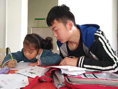 辅导活动很快就结束了,一位家长来接孩子回家时,拉着队员的手说到:“额滴娃今年才上二年级,基础不太好。额们家里人现在也教不懂。每次她就候着她姐姐来教她。”“阿姨您放心,我们下周还会过来,到时候您就让她过来就行了。我们一定好好辅导。”队长赵莹菲同学如是说。
