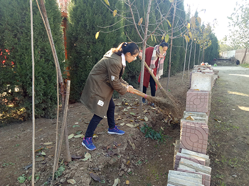 活动初始,同学们按照福利院的安排分为三组,分别进行不同的清洁工作。第一小组帮助福利院的工作人员将后院残留的建筑废料用清理清除;第二组的同学相互配合或用扫帚或用铲子将后院或堆积或散落的树叶打扫干净;第三组同学则在福利院老人李师傅的指导下将地里大量堆积的南瓜藤用耙和推车清理干净。