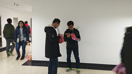 晚7点同学们准时在8号教学楼集合,为考研学子们包温暖暖与祝福。7点15,同学们动身前往8号楼的8层,9层,10层。虽然只是7点多,但考研学子们已经开始用功学习,他们坚持奋斗到最后一刻的精神让人动容。同学们送上礼品和祝福时,他们非常意外,也十分感动。