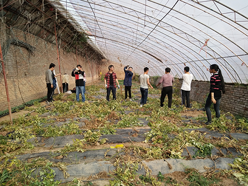 活动初始,年迈的农主向同学们简单的介绍了今天的工作。听完简单的介绍,同学们分批进入西红柿大棚。西红柿大棚长约二十米,宽约五米,深约一米,大棚上方是浅色透明薄膜,复合钢质支架。西红柿植株就在这个大棚里整齐排列,东西向排列三十排,每排约七八株,每株植株的根茎部都被正上方垂下来的细线系住固定,细线连成一片,一眼望去,宛如一个巨大的线网。进入大棚的同学们很快进行分工。全体同学一共被分为三组,第一组同学负责西红柿的采摘,第二组主要负责将植株拔出土壤,而第三组的同学负责完成最后的拆线任务。