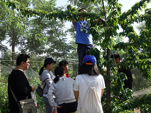 虽然这天天气炎热,不适宜在户外长时间活动。但是,1706班同学们采取了简单的防晒措施,还是兴高采烈地积极参与了。樱桃采摘园中凡是低处的果子,或是被早些来的顾客采摘殆尽,或是因一场连绵的雨而腐烂枝头,这无疑给此次活动增添了一定的阻力。好在大家并不气馁,也无意退缩。2人或4人成一组,分散开围在目标樱桃树下,采集高处的果实,各表其心,各尽其能,精诚合作。有同学借助手扶梯,攀登到高枝处采摘,其队友配合扶稳摇晃不定的梯子并递上去收集筐;还有同学在树枝能承受其的体重的前提下,攀爬上树,一边稳定重心保持平衡,一边小心翼翼探手去摘,队友们在树下帮助他克服盲区和肉眼视力局限性,指点其摘到被树叶掩盖的果子。