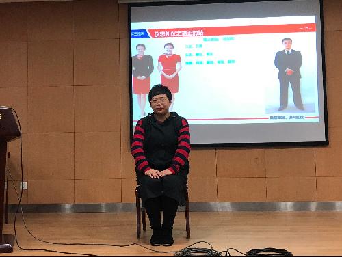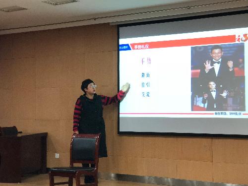 在礼仪的仪容部分。高老师指出,“穿衣是为了穿给其他人看,而不是为了愉悦自己”,高老师在讲解正装的组成部分以及男女正装之间的差别时,就如何扣西装扣子这一问题,向同学们进行了提问,同学们积极地回答老师的问题。在后面的在站姿与坐姿方面,高老师亲自为同学做出示范,同学们也很积极地跟着老师学习。通过这两次小小的互动,培训会的气氛得到了升华。