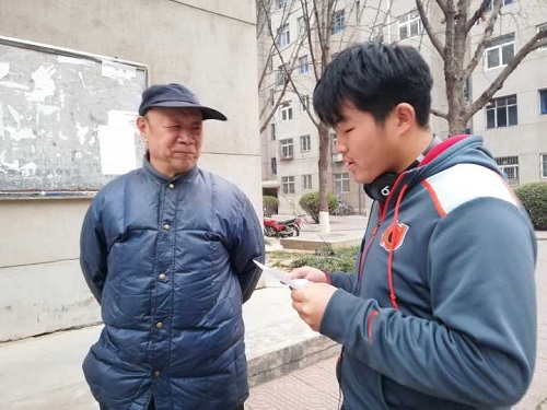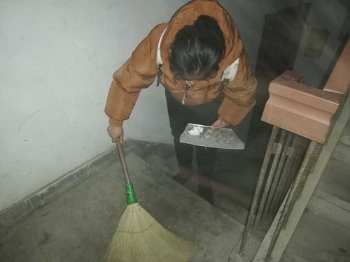 活动的第二个环节是打扫教职工社区的卫生,班级同学分为八组,每一组负责一栋楼的卫生,组内三个人分别负责扫地、擦栏杆和拖地。其中第一组的工作干的尤为突出,他们从上至下仔细打扫,不放过任何一个角落,在敲门借水涮拖把时,引来住户的频频夸赞,一位住户说到:“大学生就要多举办这样有意义的活动,这样才能让他们更加熟悉老年人的生活环境,让他们能多去主动关心老年人。”同学们打扫完公寓后,都有说有笑走了下来,互相分享着打扫时候的趣事。