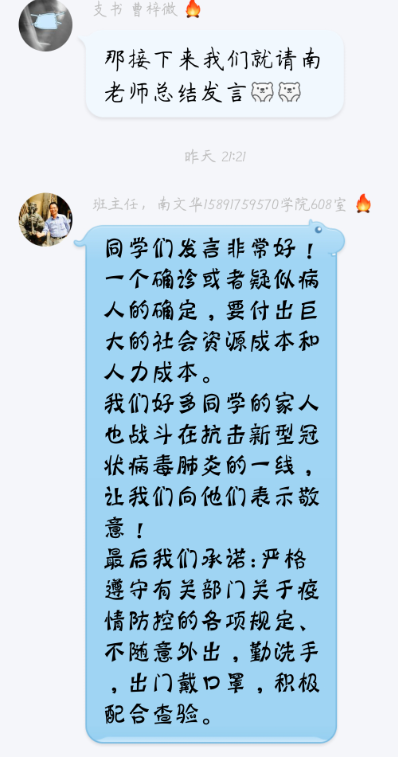 班长唐俊祥说到:“不提前返校,不随意外出,回家勤洗手,出门戴口罩,积极配合查验,每日定时汇报健康情况”,这为同学们对抗肺炎疫情提供了具体可靠的建议。随后,班主任南文华老师进行总结发言,对同学们提出建议和要求,同时对奋斗在一线的医护人员以及其他工作者表示敬意,为此次活动画上了圆满的句号。