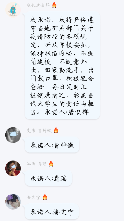 2月4日下午八时,农学类1804班团支部以QQ群为平台,准时展开本次线上团日活动。此次活动主要包括四个部分,分别是承诺并进行签名接龙、有关疫情的基本知识考察、有关疫情的情景对话、发表自己对于疫情的思考和感想。