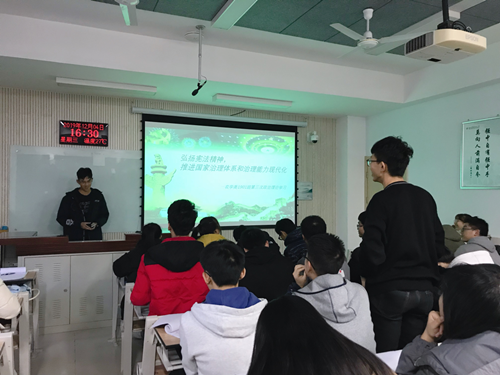 为深入贯彻落实党的十八届四中全会精神及《中共中央关于全面推进依法治国若干重大问题的决定》的相关要求,扎实推进宪法教育,弘扬宪法精神,js555888金沙老品牌于12月4日周三下午在八号教学楼举行了“弘扬宪法精神,推进国家治理体系和治理能力现代化”为主题的政治理论学习。