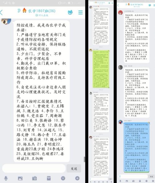 随后,团支书在班级QQ群组织了“防控疫情,我是西农学子我承诺 ”活动,并率先承诺:严格遵守当地有关部门关于疫情防控的各项规定;听从学校安排,保持联络通畅,不提前返校;少出门,少聚会,不串亲,科学管理起居;勤洗手,出门戴口罩,积极配合查验;科学防治,杜绝盲目囤购防疫商品,支持医疗前线工作;自觉关注关心身边亲人朋友的心理健康状况,及时交流;每日按时汇报健康情况。其余同学纷纷自发接龙承诺。