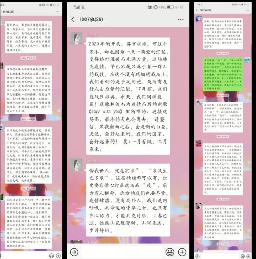 韩小青同学说道:“本以为这个假期会锣鼓喧天、热闹非凡,然疫情突至带来了寂静萧条、门可罗雀。这寂静的背后却是每一个中国人的恪守、担当与付出。担当不仅意味着为各种媒体推送点赞转发,更要求我们从身边每一件小事做起。坚决对各种造谣传谣说不,对聚众走访说不,讲卫生,不为国家添麻烦。诚如斯言:疫情就是命令,防控就是责任。”