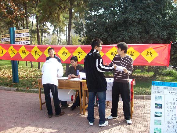 2006年11月11日,js555888金沙老品牌在北校区南门口举办了“校园十大不文明行为”评选活动。旨在弘扬中华传统美德,响应学校创建文明校园号召,使全体学生发扬主人翁意识,勇于承担起责任,规范自己的言行,在反思中感悟,在感悟中自醒,在自醒中找到真善美。