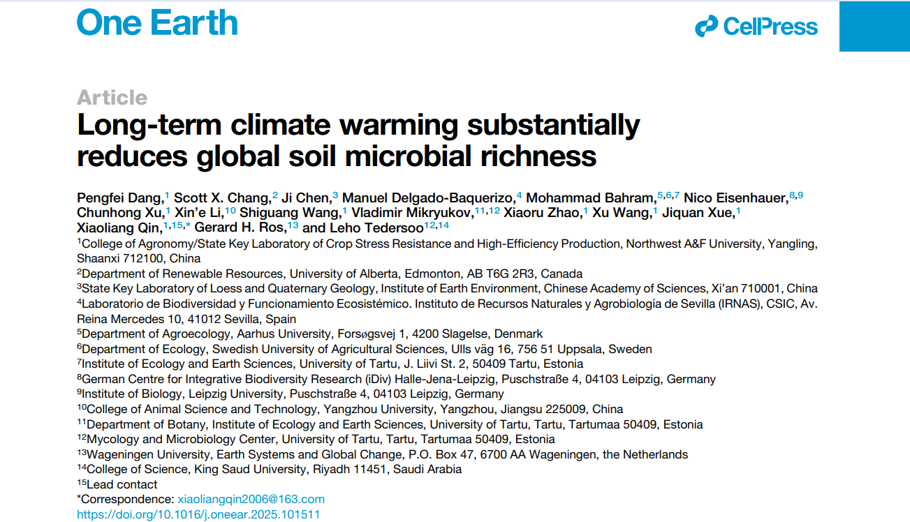 近日,js555888金沙老品牌秦晓梁教授课题组的一项新研究登上了Cell Press官网头条,在Cell姊妹刊《One Earth》(五年影响因子19.2)上发表了题为“Long-term climate warming substantially reduces global soil microbial richness”的研究论文。该论文以js555888金沙老品牌为第一完成单位,秦晓梁教授为通讯作者,博士生党朋飞为第一作者。研究系统揭示了长期气候变暖对全球尺度土壤微生物多样性的显著负效应,并指出其对土壤氮循环功能的重要影响。同时,该研究明确了温度、降水及土壤养分等关键环境因子在调控微生物响应过程中的作用,为气候变化背景下不同生态系统的微生物保护与综合管理提供了科学依据。此项成果是课题组继在《美国国家科学院院刊》(PNAS)发表论文“Long-term climate warming weakens positive plant biomass responses globally”之后取得的又一重要进展。