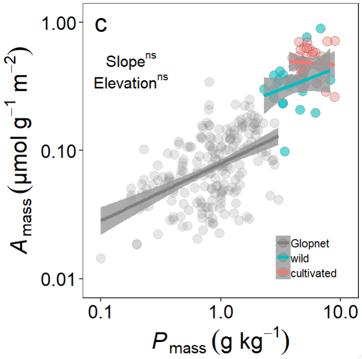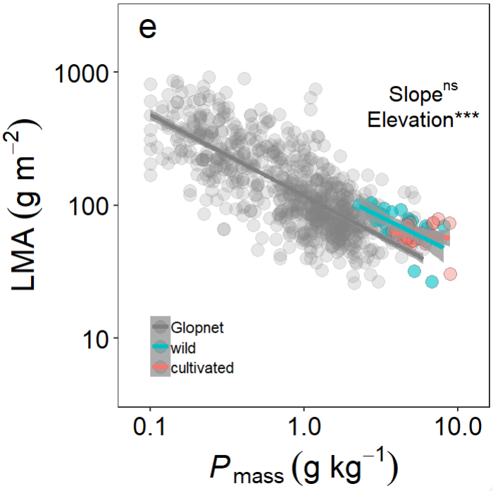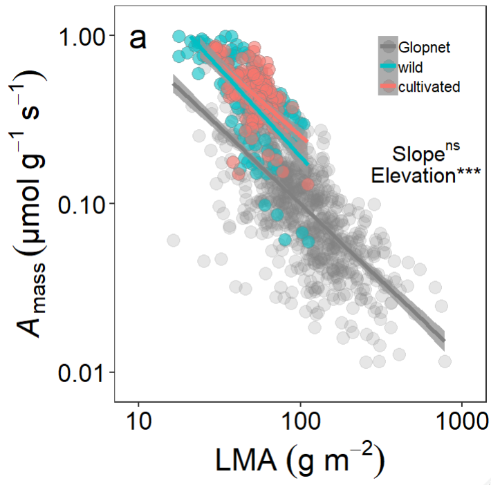 驯化是由生物互利共生驱动的协同进化过程,作物驯化涉及叶片功能性状之间关联性变化,特别是影响植物适应性、生长和生存的性状,这些性状间权衡关系被总结归纳为植物叶片经济谱。然而,关于驯化是否通过驱动性状关联网络结构变异来优化碳收益,目前仍知之甚少。本文通过收集54个野生和栽培种作物叶片功能、生化及形态性状数据,分析发现作物通常位于全球经济谱的快速投资收益末端,表现为较小比叶重、较高单位质量光合速率以及叶片氮磷含量(图1和2)。作物通常生长在资源充足的农田环境中,因此倾向于聚集在经济谱的快速资源获取末端(图1),将资源高效地转化为生物量和经济产量。