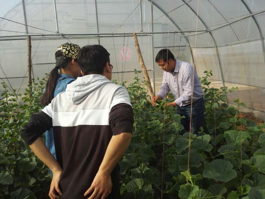 队员们第一次的进棚实践,激动与憧憬,闪烁着,跳跃着,在脸庞,在心中。过程中,理事长亲自下田,为队员们示范讲解为甜瓜缠瓜蔓的过程。将瓜藤轻轻扶起,在每一节叶子处,用红线环绕一圈,直到瓜蔓直立的依附在竖起的红线上。看似简单的过程,其实是实实在在的考验。你要理解原理,均匀光照保证品相与品质;你要拥有耐心,动作轻柔以防折断叶子;你要掌握技巧,保质保量又能提高效率。