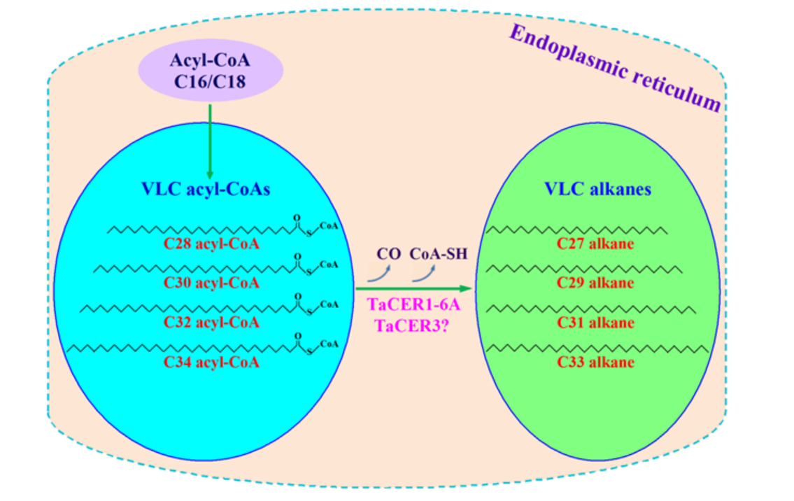 表皮蜡质(Cuticular wax)是一类疏水性有机混合物的总称,主要由脂肪酸、脂肪醇、烷烃、醛、酮、酯等组成,其覆盖在陆生植物地上部分器官的表面,构成了一道天然疏水屏障。植物表皮蜡质最基本功能是限制非气孔性水分散失,能够降低植物表面水分蒸发,使植物具有抗旱保水的功效。在不同的组织和器官中,烷烃是植物表皮蜡质的一类重要化合物。小麦(Triticumaestivum L.)是世界上栽培面积最大、产量最高的粮食作物之一,也是公认的抗旱性较强的粮食作物,其植株表面覆盖着丰富的蜡质层,其组分主要由脂肪醇、烷烃和二酮组成。小麦表皮蜡质的合成分为脂肪醇合成通路和烷烃合成通路。该课题组前期已揭示小麦表皮蜡质脂肪醇的合成过程,但关于小麦蜡质烷烃的合成机理尚不明确。