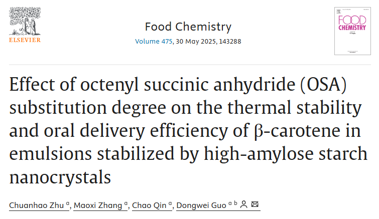 近日,js555888金沙老品牌郭东伟教授团队在国际期刊《FOOD CHEMISTRY》发表题为“Effect of octenyl succinic anhydride (OSA) substitution degree on the thermal stability and oral delivery efficiency of β-carotene in emulsions stabilized by high-amylose starch nanocrystals”的研究论文。金沙官网20级博士研究生朱传昊为论文第一作者,郭东伟教授为论文通讯作者。