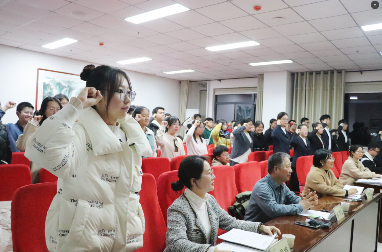 会上,学院组织开展了2024年新发展团员入团仪式和入团宣誓,学院党委副书记吴清华和“银龄辅导员”薛智德为新发展团员代表颁发团员证、佩戴团徽,学生团员代表常斓缤在表态发言中表示会以本次团校学习为契机,坚定理想信念,牢记团的宗旨,严守团的纪律,用实际行动践行团员职责、为团组织增光添彩。