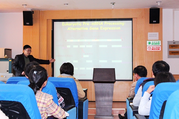 徐如强博士从RNA的构成、剪切、合成及最后的转基因等过程向参会师生进行了一一讲解。徐如强博士还结合工作实际和与会师生进行了沟通和交流。