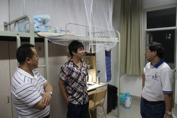 院长廖允成在副院长杜世平和研究生秘书等人员的陪同下,走进南校区15号楼看望男生。他每到一个宿舍都先了解学生的基本情况,他对由外校考入的学生尤为关心,不断关切地询问他们来后饮食、气候是否适应,生活物品是否购置齐全,不时地嘱咐他们遇到什么困难都随时可以与院领导、研究生秘书和辅导员联系。