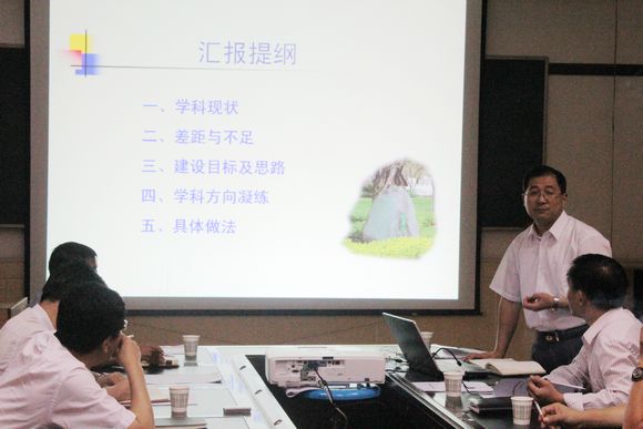 会上,院长廖允成教授再介绍完参加今天学科规划讨论会的专家教授及学院领导后;代表学院向校长孙其信教授介绍了我们学院以前和正在做的有关学科规划的工作,并以ppt形式介绍了学科的整体规划,从学科现状、差距与不足、建设目标及思路、学科方向凝练及具体做法等5个大的方面进行了汇报。