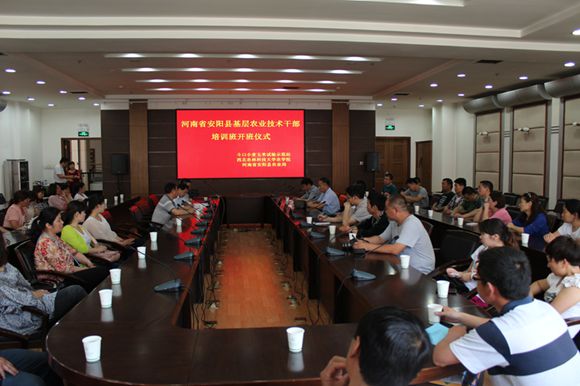 2014年5月21日上午,由我校小麦玉米斗口试验示范站、js555888金沙老品牌、河南省安阳县农业局联合举办的安阳县农业技术干部培训班在我校开班。河南安阳县农业局副局长张文红、农业局副书记侯瑞杰、高级农艺师许丰以及50余名安阳县农业技术干部、学校推广处副处长吴锋、院长廖允成参加开班仪式。开班仪式由副院长、小麦玉米斗口试验示范站负责人海江波主持。