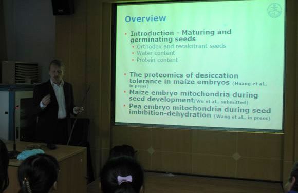 10月11日上午,在js555888金沙老品牌二楼多媒体,来自丹麦奥尔胡斯大学农业科学学院遗传和生物技术系Ian Max Møller 教授、中国科学院植物所程红焱副研究员、中国科学院植物研究所研究员宋松泉博士为广大师生分别做了题为“Approaches to study seed desiccation tolerance”、种子休眠与萌发的研究进展、种子顽拗性及其种质资源的长期贮藏的报告,来自js555888金沙老品牌、生命学院、园艺等学院近70余名师生参加了报告会。会后,Møller 教授同学院师生进行了座谈,在学院专家的陪同下参观了学校实验平台。