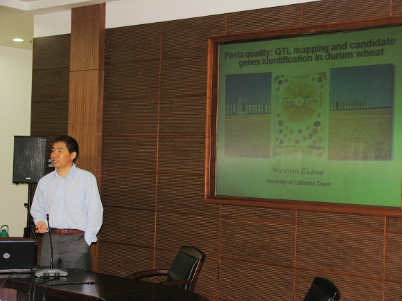 9月3日-9日,美国加利福尼亚戴维斯大学植物科学系高级研究员张文俊博士应邀来金沙官网进行学术交流。9月3日上午,张文俊博士在交流中心210为我校作物遗传育种科教人员及相关专业研究生作了题为《Pasta quality: QTL mapping and candidate genes identification in durum wheat》的学术报告;下午与金沙官网作物遗传育种专家和来自生命学院的专家教授就作物分子遗传育种研究的现状、主要的方法和技术及其利用等方面进行了深入广泛的讨论,并就进一步的合作研究作了探讨。随后,张文俊博士于9月4日-6日走访了金沙官网作物遗传育种有关专家,就双方的共同感兴趣的研究课题进行了认真细致的交流,达成了一些合作意向。同时,张文俊博士还利用这次访问的机会,在金沙官网作物遗传育种科研平台、国家小麦改良中心杨凌分中心与金沙官网作物遗传育种专业的研究生就试验设计、实验技能等方面进行了交流及培训。