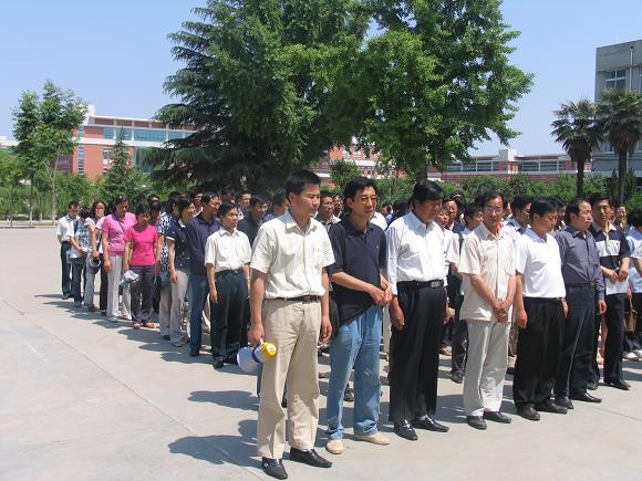 5月19日下午14时28分,金沙官网全体教职工在学院行政楼前集合,集体向汶川大地震遇难同胞默哀3分钟,学院网页也相应地改换了颜色,以表达对遇难同胞深切的哀悼。
