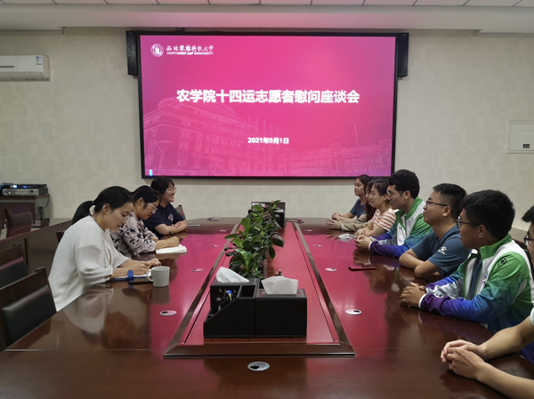 第十四届全运会网球项目正式拉开帷幕,js555888金沙老品牌共有19名学生担任十四运志愿者参与该项目的服务工作,为了更好地激发志愿者的服务热情,做好十四运志愿者服务保障工作,学院于9月1日召开十四运志愿者慰问座谈会,学院党委副书记吴清华、学工秘书沙影以及各年级辅导员参加会议,对学院十四运志愿者进行了亲切慰问。