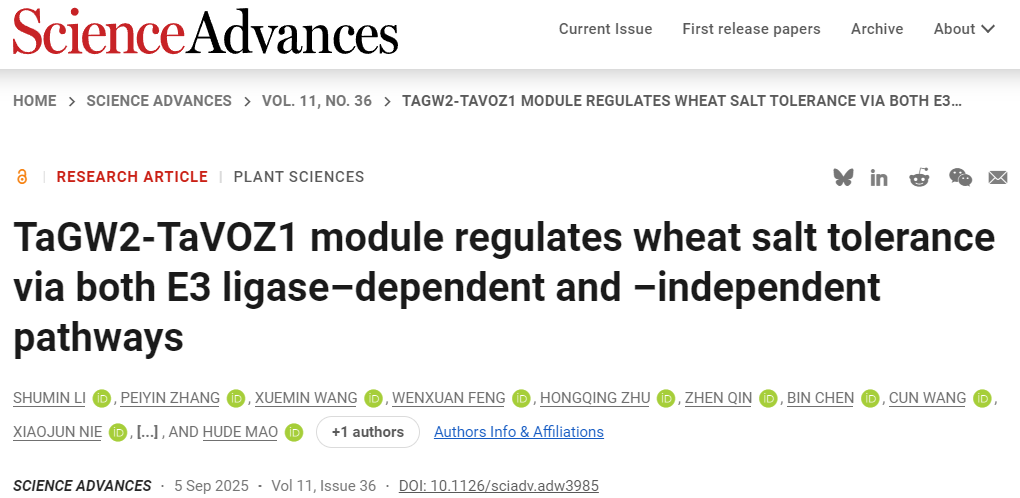 近日,js555888金沙老品牌作物抗逆与高效生产国家重点实验室康振生院士/毛虎德研究员课题组在Science Advances杂志发表了题为“TaGW2-TaVOZ1 module regulates wheat salt tolerance via both E3 ligase-dependent and -independent pathways”的研究论文,首次揭示了TaGW2的双重功能,即兼具E3泛素连接酶和转录抑制因子活性,阐明了TaGW2-TaVOZ1模块通过“泛素化降解”与“转录竞争”两种机制共同调控小麦耐盐性的分子机制,突破了此前对E3连接酶功能的单一认识,为耐盐高产小麦新品种培育提供了重要理论依据和基因资源。