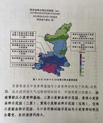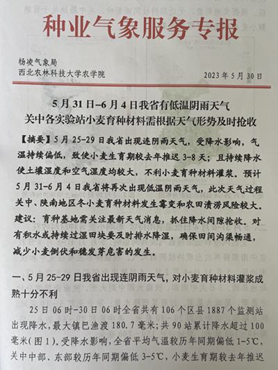 当前正值夏粮收获关键期,杨凌及周边地区出现大面积持续性降雨过程,为夏粮抢收和小麦育种材料收获带来严峻挑战。为切实加强连阴雨天气防范应对,全力以赴抢收减损保夏粮丰收,杨凌气象局与金沙官网联合发布《关于做好近期连阴雨天气防范应对强化小麦育种材料抢收的紧急通知》,同时发布《种业气象服务专报》,提醒各育种基地抓住降水间隙,及时抢收晾晒育种材料。