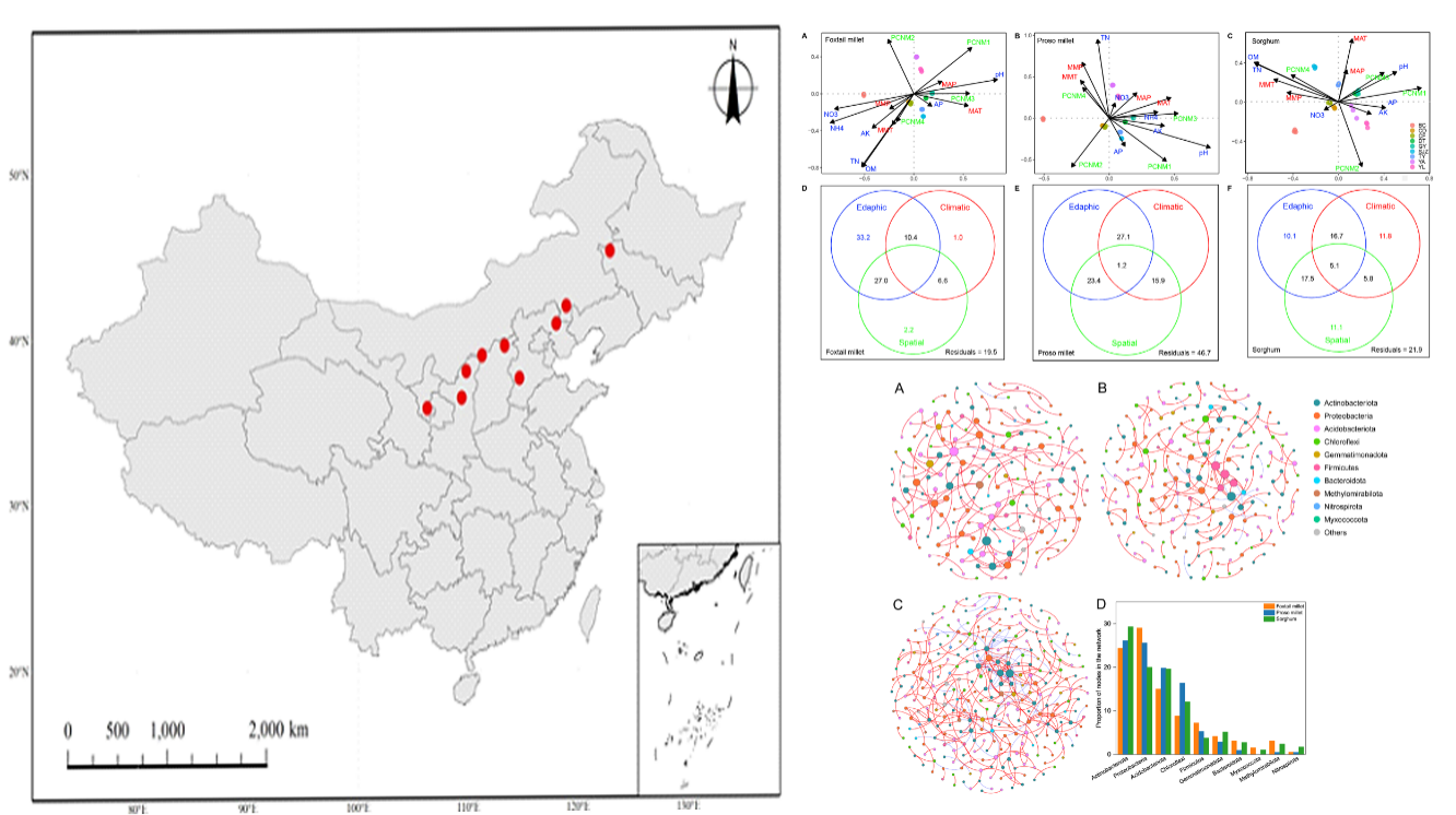 团队还利用高通量测序技术,探索了中国北方12个地区糜子根际细菌和真菌的空间分布和关联网络。研究发现,环境选择是决定根际细菌β多样性的唯一因素,而根际真菌β多样性受环境选择和扩散限制的制约,年平均温度和土壤pH是调节糜子根际细菌和真菌群落结构、关键物种和调节的主要生态驱动因素。