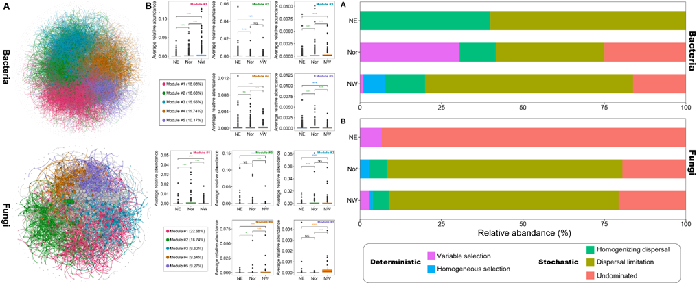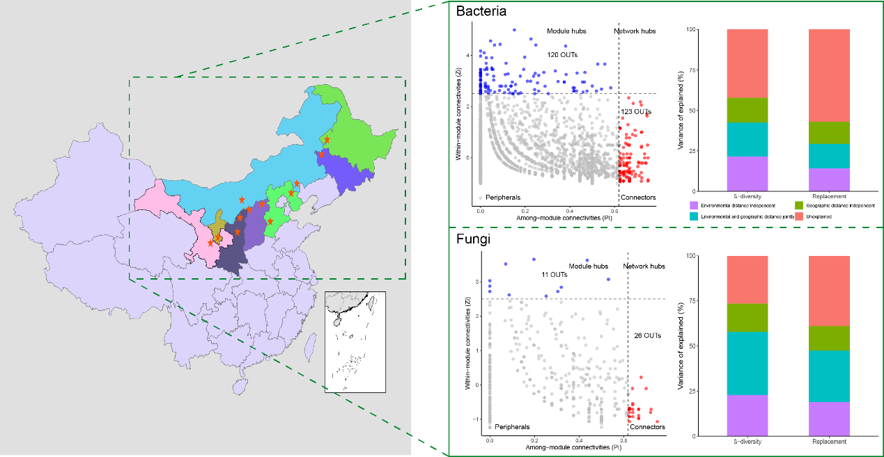 研究发现,东北、华北和西北地区的环境因子、多样性、分类和功能组成存在显著差异。Mantel测试表明,华北和西北地区的细菌和真菌群落多样性主要与土壤养分(即有效磷、NO3--N、NH4+-N和有机质)有关。此外,细菌和真菌网络的拓扑特性因地区差异而不同,华北和西北地区的这些网络更加复杂,网络中的细菌和真菌物种在该地区共同出现的频率更高。研究还确认,东北和华北细菌和真菌网络中的OTU的平均相对丰度在模块集线器中占据较高比例,而在华北的网络中,连接器中的更多OTU富集。一般来说,随机过程在约束三个区域的装配方面相对更为重要;然而,扩散限制控制了东北和西北地区的细菌群落集合的临界周转。