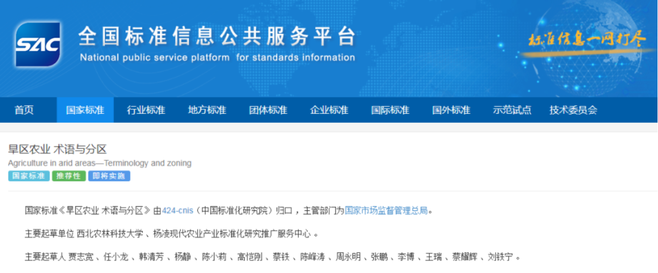 根据国家标准公告2022年第13号,由金沙官网贾志宽教授负责起草制定的国家标准《旱区农业 术语与定义》于10月12日正式发布,将于2023年5月1日开始实施。自此,旱区农业领域有了标准的基础术语定义和分区指标。