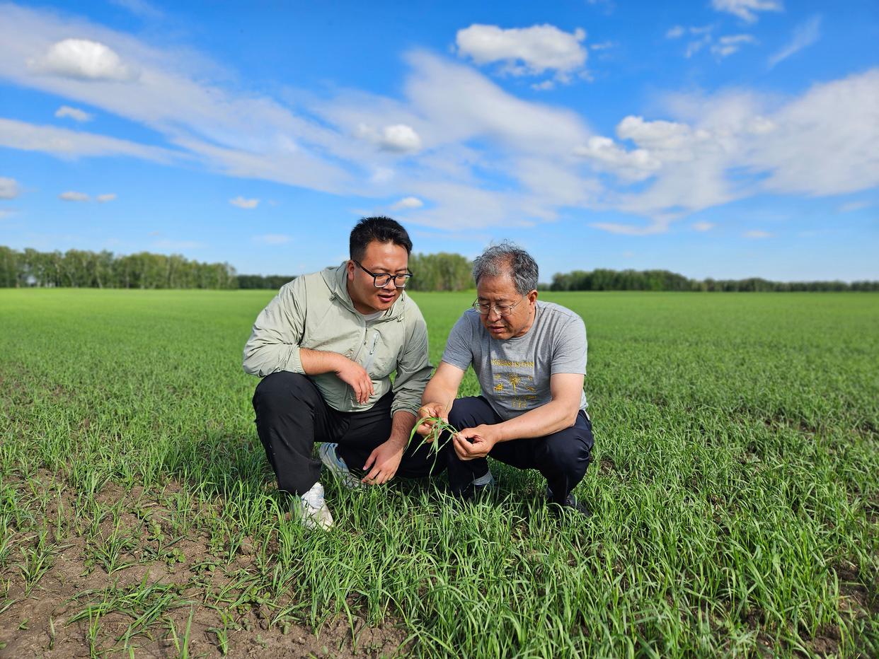 2024年6月19日,js555888金沙老品牌教授张正茂(右)与学生在哈萨克斯坦北哈州的农业示范园调查小麦生长情况。