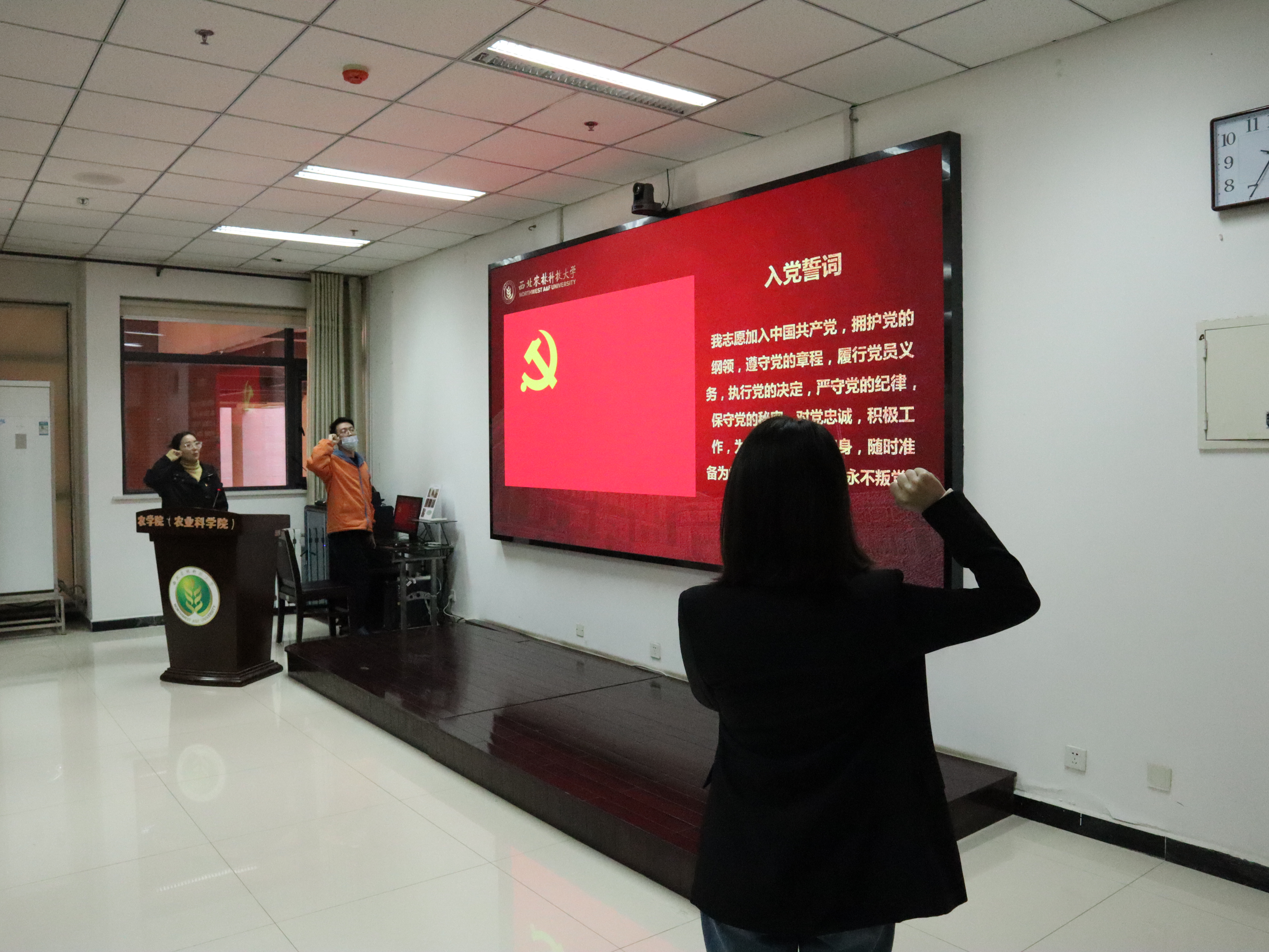 党员徽章是用于党员个人佩戴、表明共产党员政治身份的象征和标志。通过佩戴党员徽章能够使党员置身于党内外监督之下,有效激发党员“第一身份”意识,强化党员党性观念。启动仪式上吴清华分别为新发展教师党员和新入职学工干部佩戴党徽;12位党支部书记分别为47名新发展学生党员佩戴党徽。随后,新入职辅导员张钰琪带领全体同志一起重温入党誓词。