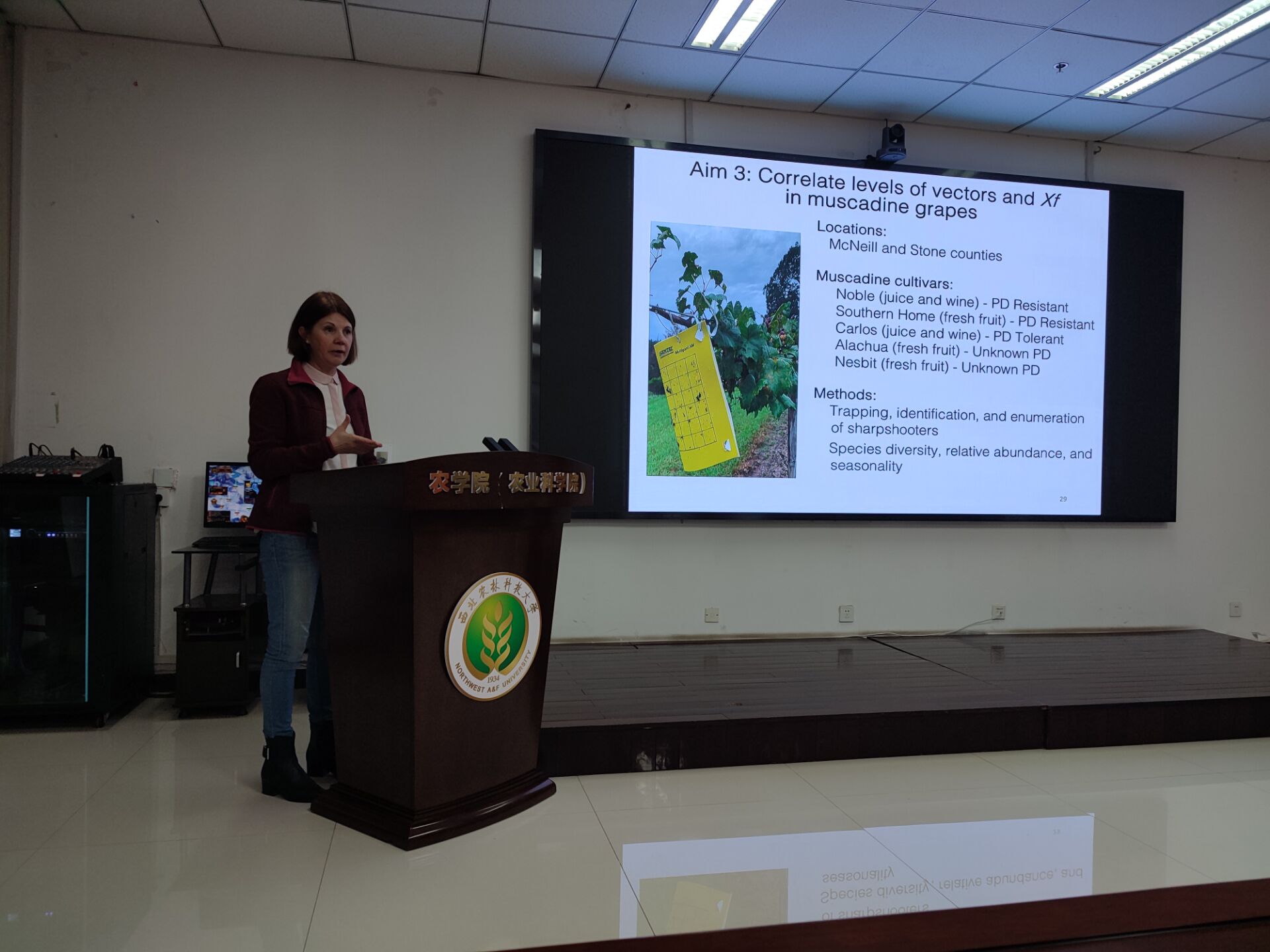2023年12月22日上午,美国南密西西比大学 Olga Mavrodi应邀来金沙官网进行学术交流,为金沙官网100余师生做了题为“Xylella fastidiosa in bunch and muscadine grapes from the southern Mississippi”的学术报告。