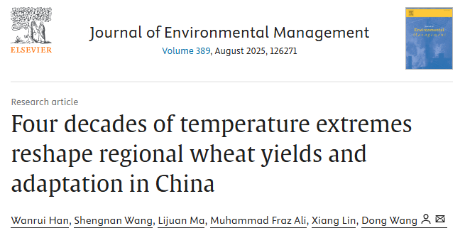 近日,js555888金沙老品牌王东教授团队在国际期刊《Journal of Environmental Management》发表题为Four decades of temperature extremes reshape regional wheat yields and adaptation in China研究论文。金沙官网2022级博士生韩婉瑞为论文第一作者,王东教授为论文通讯作者。