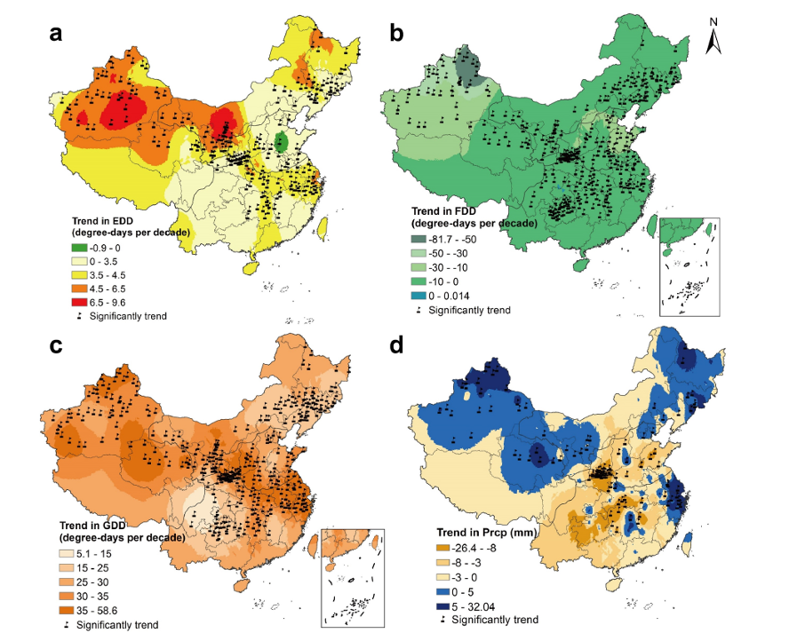 当综合考虑极端生长度日(EDDs)、冷冻度日(FDDs)和生长度日(GDDs)的变化时,南方冬麦区(SW)、北方冬麦区(NW)、冬春麦区(WS)和春麦区(SP)的小麦产量分别减少1.52%2.42%2.45%3.28%。尽管降水增加使春麦区(SP)和冬春麦区(WS)的小麦产量分别提高0.84%1.65%,但这一效应仍不足以抵消极端温度造成的损害。